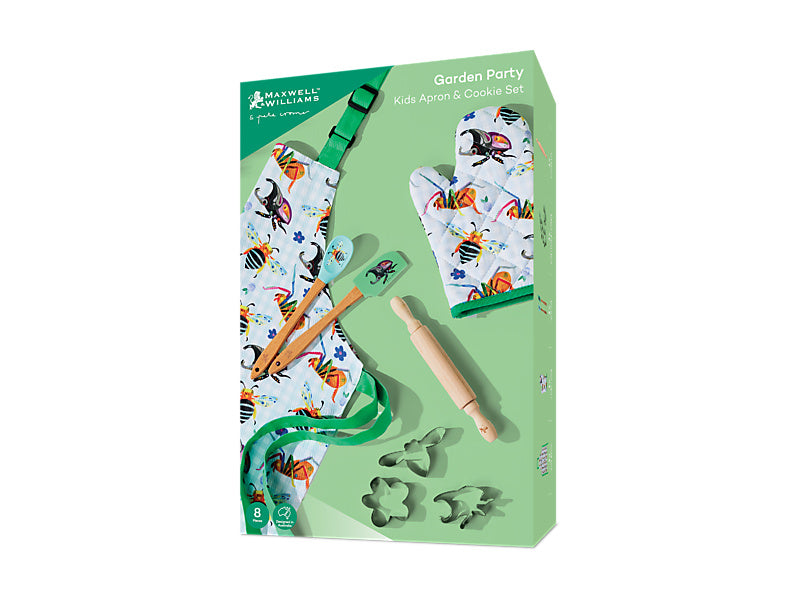This Garden Party eight-piece kids’ apron & cookie set features a series of original insect designs by iconic Australian artist Pete Cromer. With a cute apron, oven mitt, rolling pin, spatulas and cookie cutters, this gorgeous set has everything a kid needs to bake up a storm in the kitchen. Designed with Pete’s signature charming style and beautiful detail, it’s a fun and colourful set that any little chef is sure to love.
