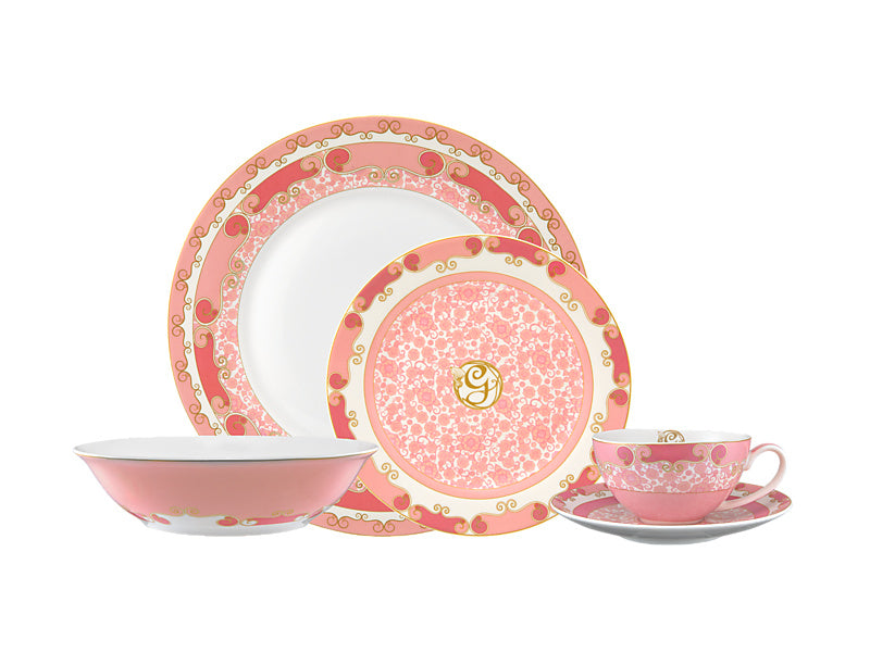 - A beautiful 20-piece decaled dinner set, featuring 4 dinner plates, 4 side plates, 4 bowls, and 4 cups with saucers